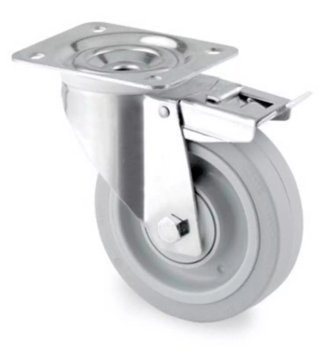 Industrihjul med grå elastisk gummibane samt presisjonskulelager eller rullelager i hjul for myk og skånsom gange. Holder av galvanisert stålplate, doble svingkranslagre med tetningsbeskyttelse mot smuss. Dobbeltvirkende bremsefunksjon der låsing skjer for både hjul og svinglager. UFR = rullelager , UFP = kullelager * = blått hjul